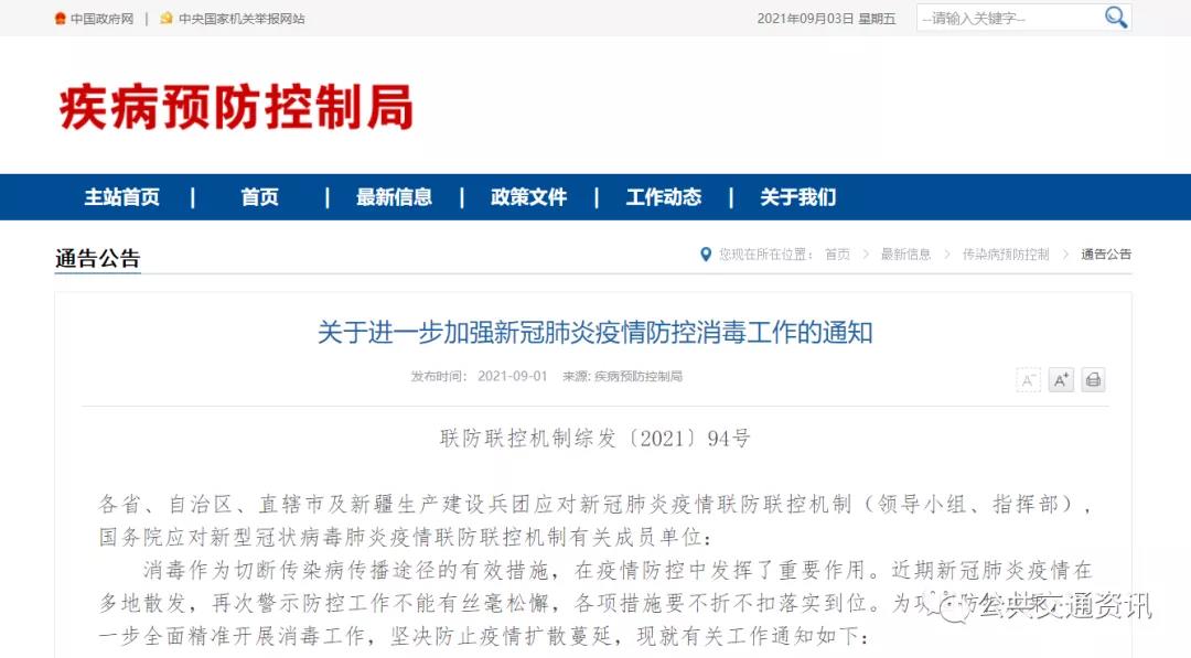 2021年8月31日,国务院应对新型冠状病毒肺炎疫情联防联控机制综合组印发了《关于进一步加强新冠肺炎疫情防控消毒工作的通知》(联防联控机制综发〔2021〕94号),发布了《公共交通工具消毒操作技术要求》。