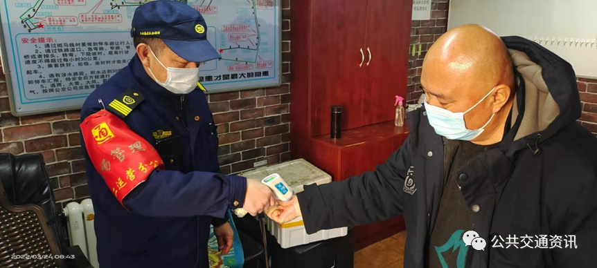 车队要求驾驶员上岗前对自己的健康码、核酸检测信息、行程码扫描后截图发到工作群内,车队备存,每日进行体温自测,发现症状,立即上报,居家观察。上岗时,值班队长需对上岗驾驶员进行测温,保证调度室内人员不聚集,尽量避免交谈。如发现体温异常或身体不适者,由车队防疫保障人员引导其进入隔离室,进行消毒、体温检测、登记等,待其离开后,工作人员对室内进行全方位消毒。