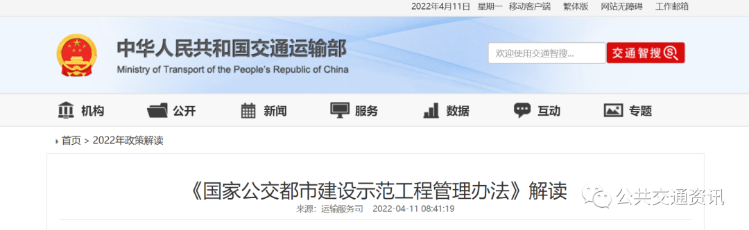 日前,交通运输部发布了《关于印发<国家公交都市建设示范工程管理办法>的通知》(交运发〔2022〕38号,以下简称《管理办法》)。为便于各级交通运输管理部门深入理解并切实做好贯彻实施工作,现就《管理办法》有关内容解读如下: