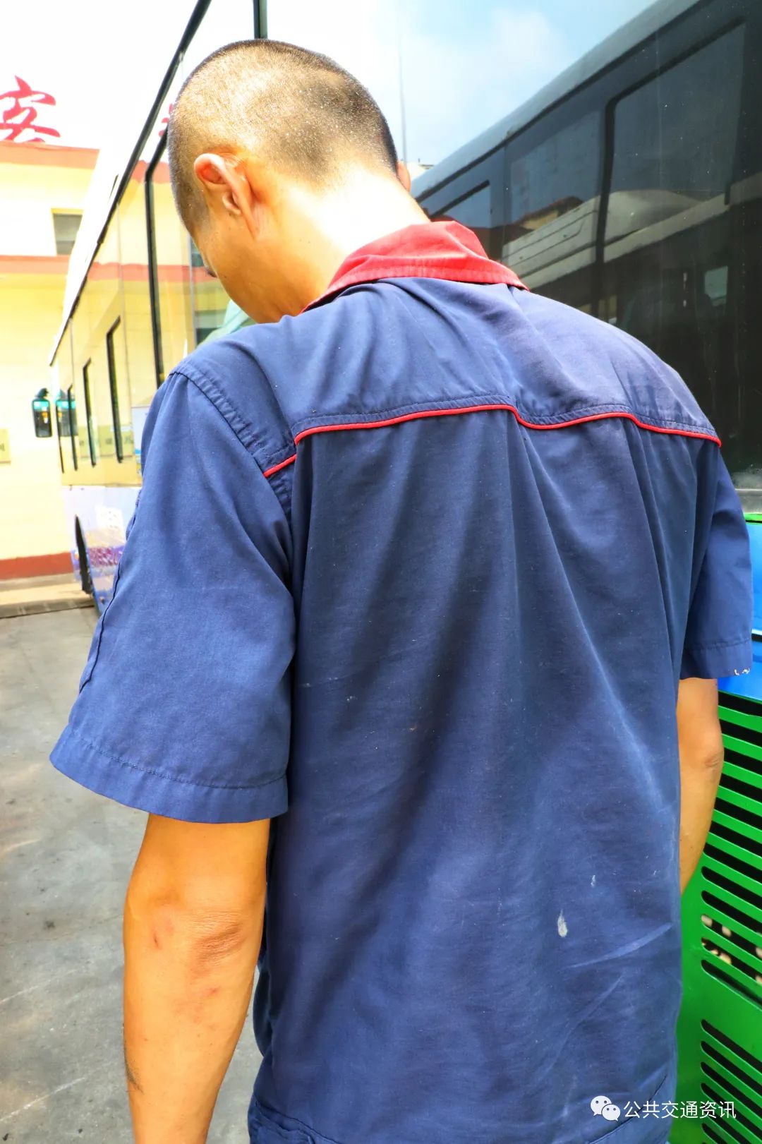 8月4日中午,艳阳高照,公交场站内的车辆在太阳的炙烤下车皮发烫。王云飞绕车巡视一周后,打开发动机舱盖,一股热浪迎面扑来,他屏住呼吸后退几步,待热气稍散,探身到舱内查找故障点,胳膊不慎蹭到高温的管路立时红了起来。