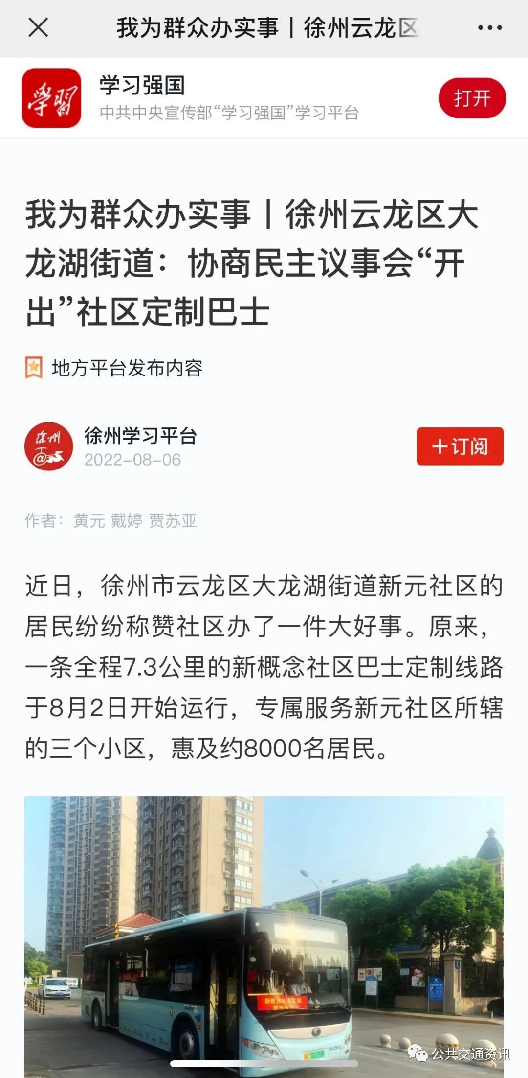 8月2日早晨,首班社区定制线路开通。8月6日,学习强国徐州学习平台刊登了文章《我为群众办实事丨徐州云龙区大龙湖街道:协商民主议事会“开出”社区定制巴士》,社区居民们纷纷赞扬:“定制巴士的想法特别好,既解决了修路造成的出行问题,又打破了‘最后一公里’的束缚,为地铁接驳、买粮购菜的居民提供了便利的服务。”