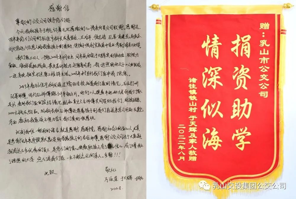 8月26日,贫困学子于航在母亲的陪同下,来到乳山交投集团公交公司,送上了一封手写的感谢信和一面写有“捐资助学 情深似海”的锦旗,向这群爱心陪伴、持续资助他们4年的“公交亲人”表达感谢,并向工作人员讲述了他们一家与8位公交人的暖心故事。