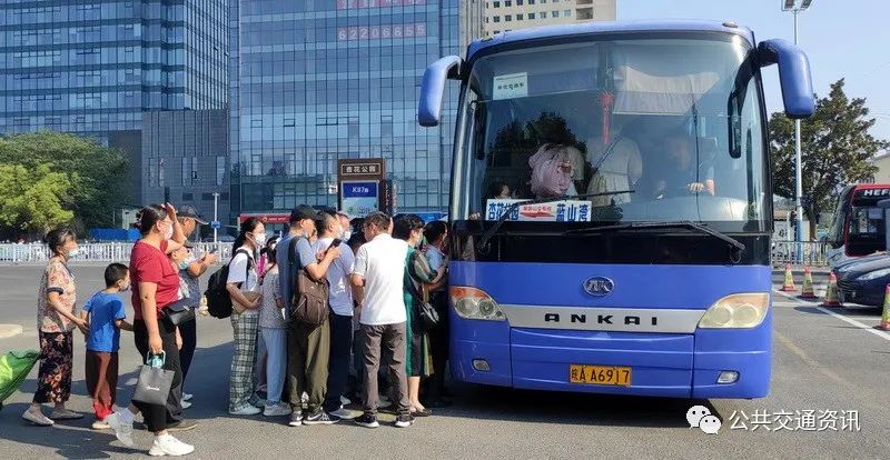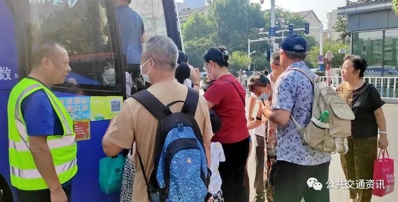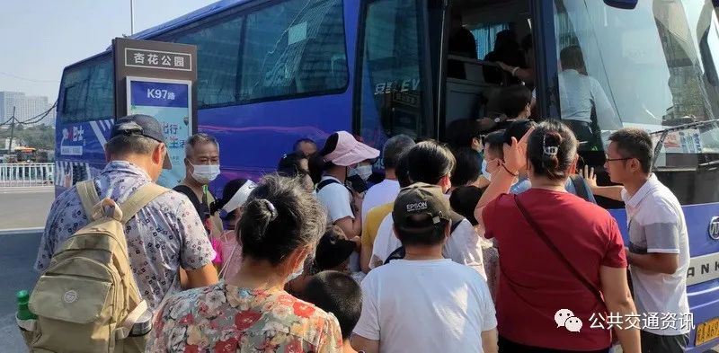 又一批游客赶来杏花公园公交首末站,乘坐旅游公交大巴赴周边县市观光休闲。