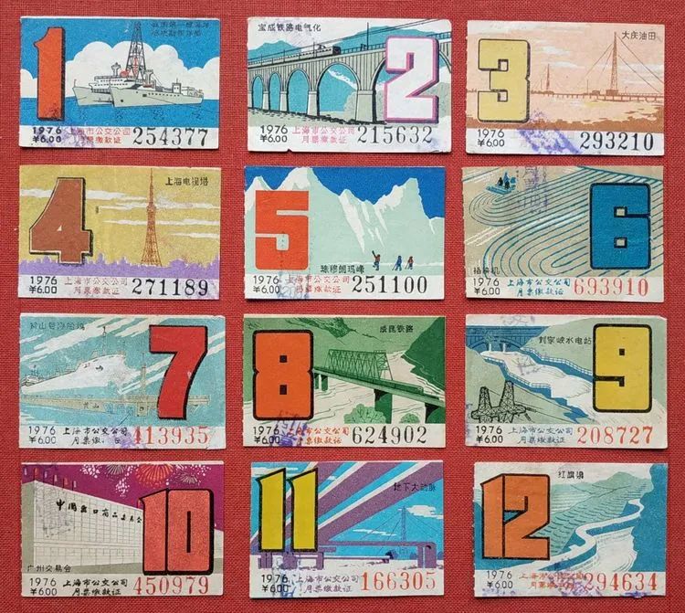 欣赏1976年全年的12枚公交月票花,其内容与形式,也达到了一个全新的高度。一枚小小的月票花,好似一幅袖珍的美术作品。每幅图案布局合理,匠心独到,气势壮观,美轮美奂。画面中每个阿拉伯数字,在整幅画面上的安置定位都是那么的恰到好处。12枚月票花上的内容名称分别是,1月份 :我国第一艘海洋地质勘探浮船;2月份 :宝成铁路电气化;3月份 :大庆油田;4月份 :上海电视塔;5月份 :珠穆朗玛峰;6月份 :插秧机;7月份 :黄山号浮船坞;8月份 :成昆铁路;9月份 :刘家岭水电站;10月份 :广州交易会;11月份 :地下大动脉;12月份 :红旗渠。