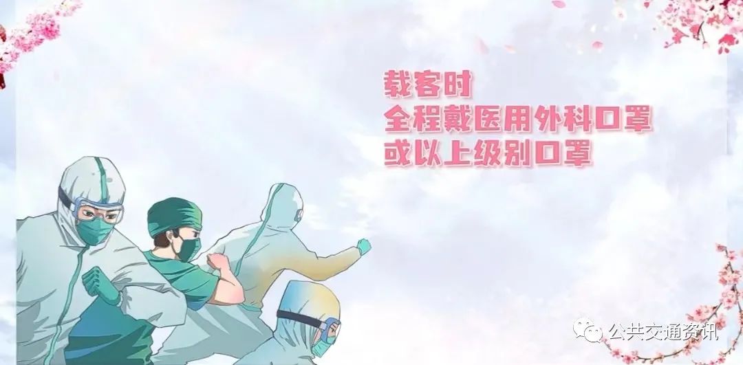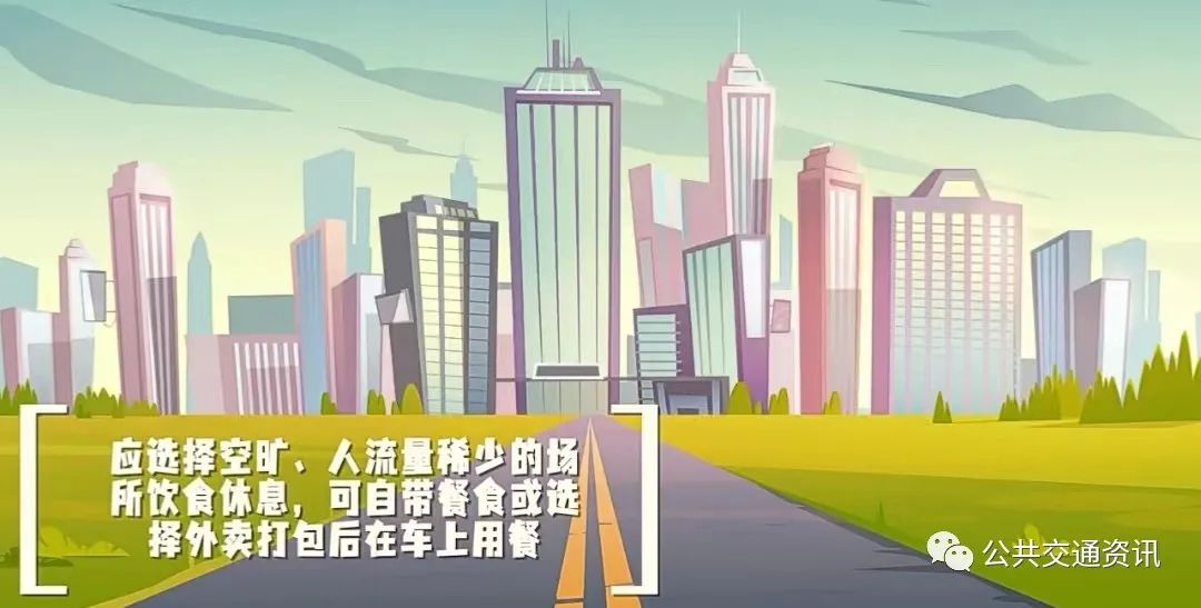 载客时应全程佩戴医用外科口罩或以上级别口罩,并提醒车上乘客佩戴一次性使用医用口罩、医用外科口罩或以上级别口罩。运行期间可半开车窗保持空气流通。(阴雨等不良天气车窗不宜打开时,保证车辆外循环开启)应选择空旷、人流量稀少的场所饮食休息,可自带餐食或选择外卖打包后在车上用餐。