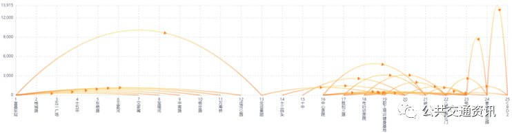 线路OD分析,是利用线路OD模型,加上泊松算法,对乘客再各条线路上的OD记录展示的一个页面。利用图表形式,用户可清晰的看到各条线路上乘客上车/下车的详情,了解各线路上乘客的乘车习惯,从而针对乘客的乘车详情做到线路优化,排班优化。线路OD图,利用箭头、曲线的显示表示乘客的乘客上下点以及客流数据。通过查看OD图,可清晰的看到该线路下,乘客的乘车流向,从而在线网优化时,针对客流较少或线路上明显的断层区域去做优化。