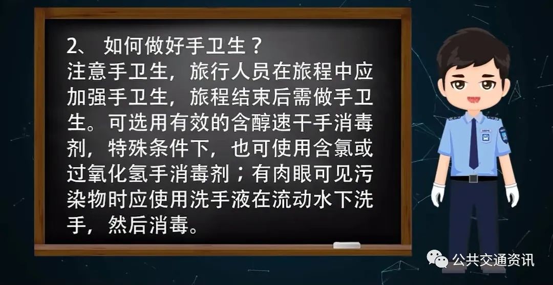 注意手卫生,旅行人员在旅程中应加强手卫生,旅程结束后需做手卫生。可选用有效的含醇速干手消毒剂,特殊条件下,也可使用含氯或过氧化氢手消毒剂;有肉眼可见污染物时应使用洗手液在流动水下洗手,然后消毒。