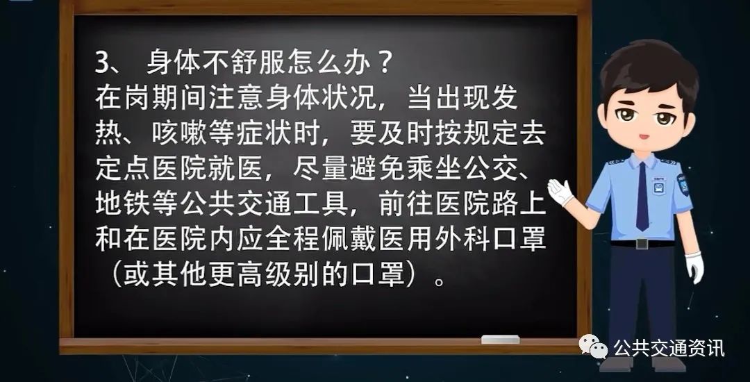 在岗期间注意身体状况,当出现发热、咳嗽等症状时,要及时按规定去定点医院就医,尽量避免乘坐公交、地铁等公共交通工具,前往医院路上和在医院内应全程佩戴医用外科口罩(或其他更高级别的口罩)。