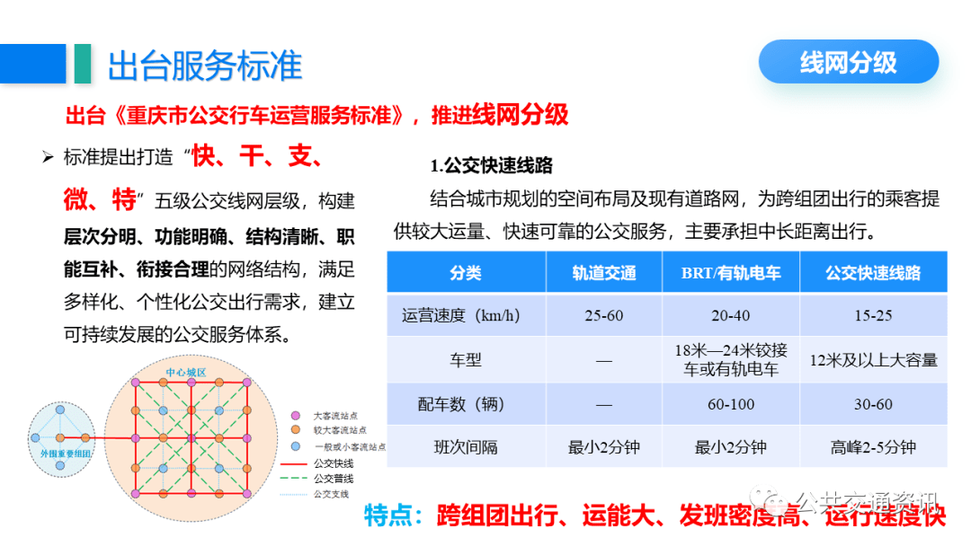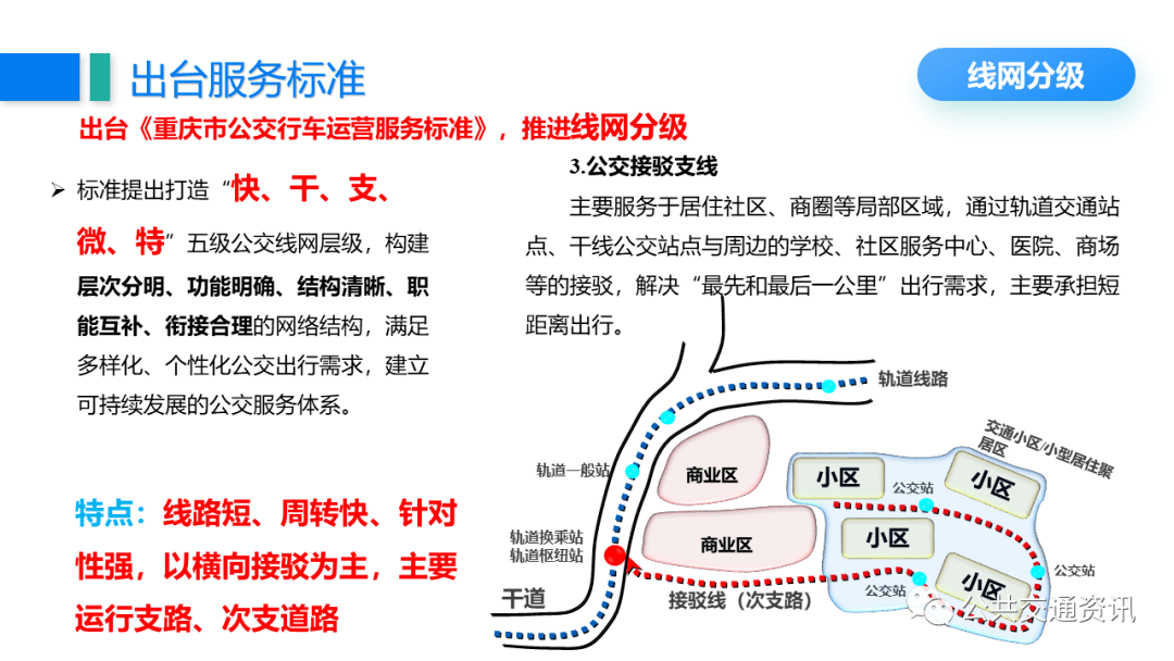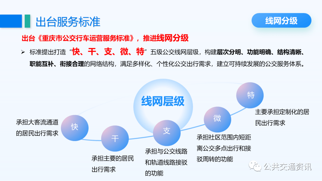 一是推进线网分级。标准提出打造“快、干、支、微、特”五级公交线网层级,构建层次分明、功能明确、结构清晰、职能互补、衔接合理的网络结构,满足多样化、个性化公交出行需求,建立可持续发展的公交服务体系。