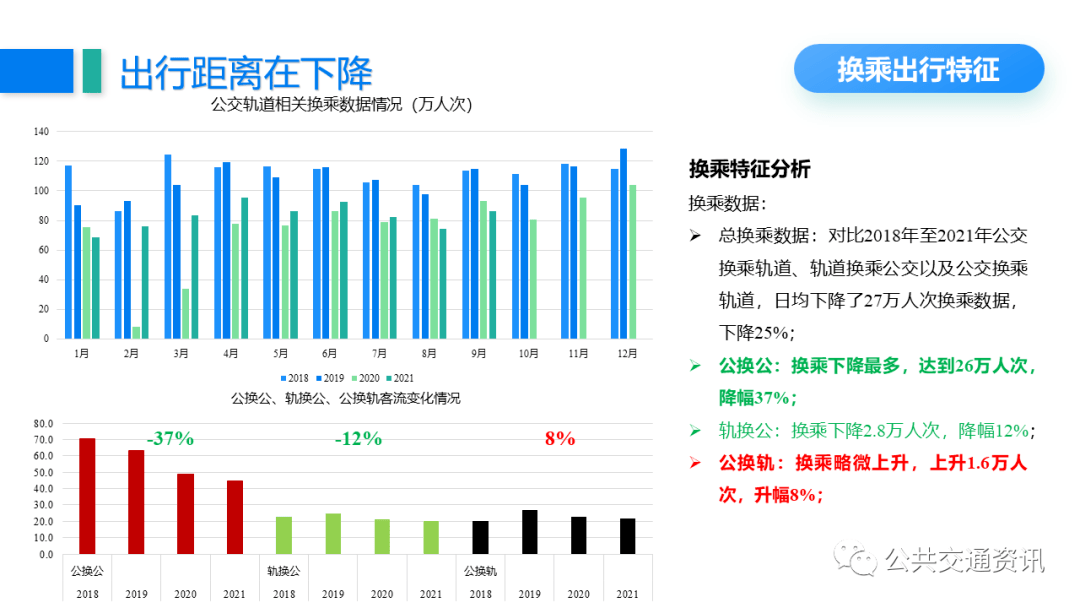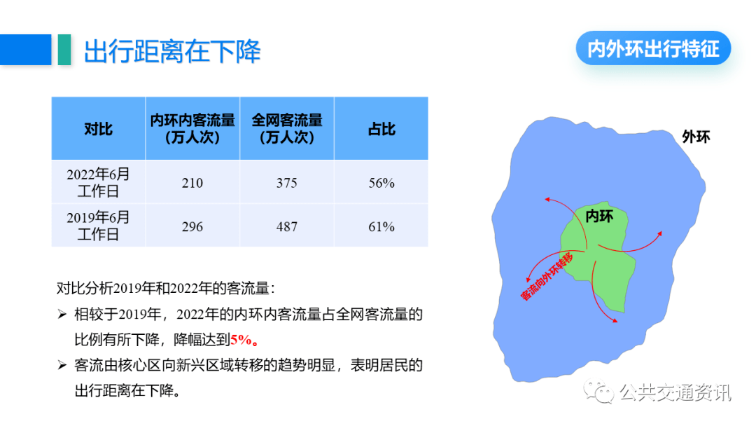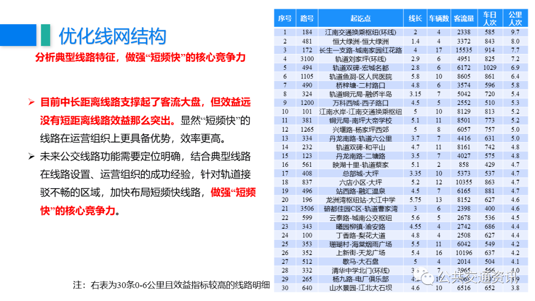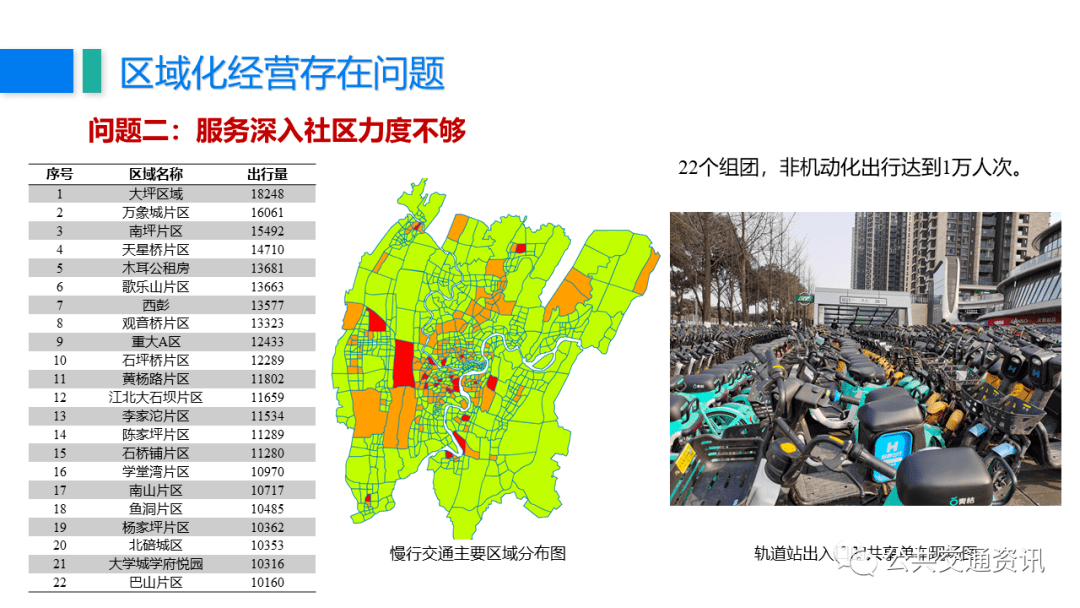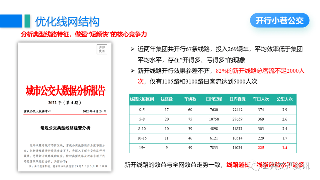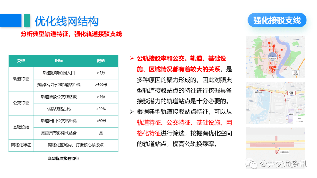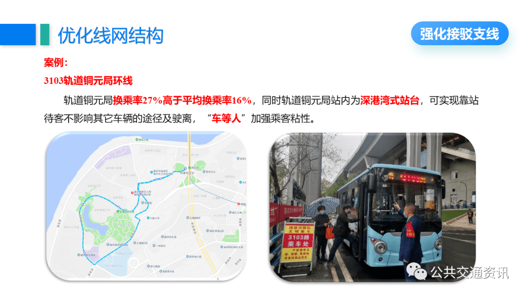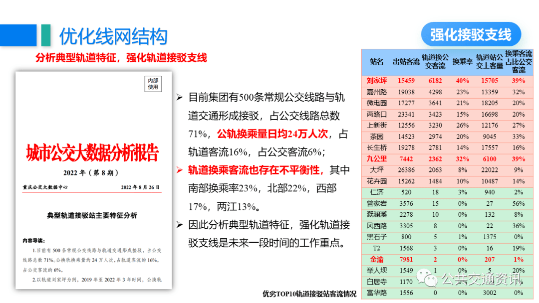 二是优化线网结构。目前集团有500条常规公交线路与轨道交通形成接驳,占公交线路总数71%,公轨换乘量日均24万人次,占轨道客流16%,占公交客流6%;轨道换乘客流也存在不平衡性,其中南部换乘率23%,北部22%,西部17%,两江13%。因此分析典型轨道特征,强化轨道接驳支线是未来一段时间的工作重点。