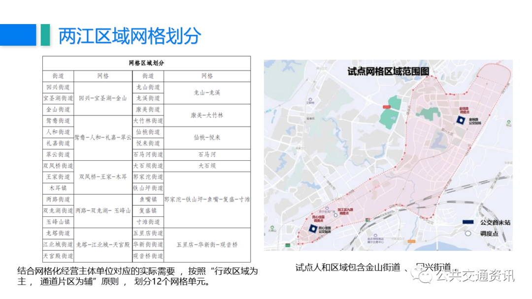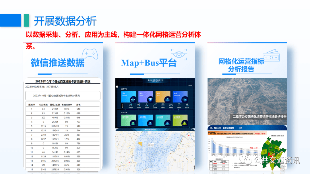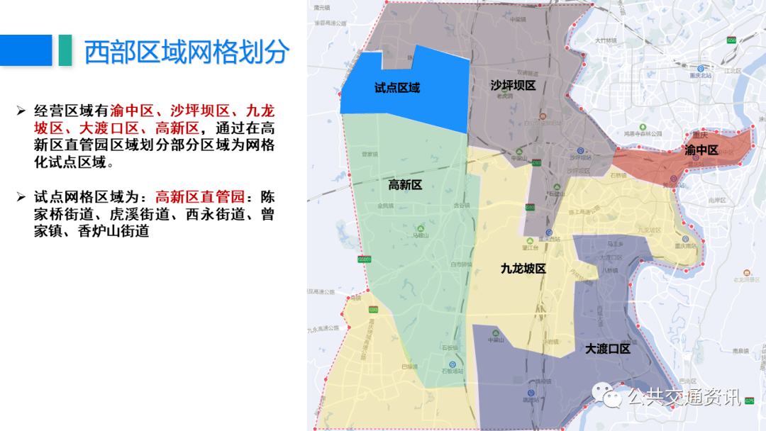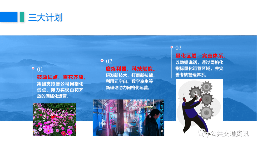 重庆公交集团未来将开展的工作:一是鼓励试点,百花齐放。集团支持各公司网格化试点,努力实现百花齐放的网格化运营;二是磨炼利器,科技赋能。研发新技术,打磨新技能,利用元宇宙、数字孪生等新理论助力网格化运营;三是量化区域,完善体系。以数据说话,通过网格化指标量化运营区域,并完善考核管理体系。