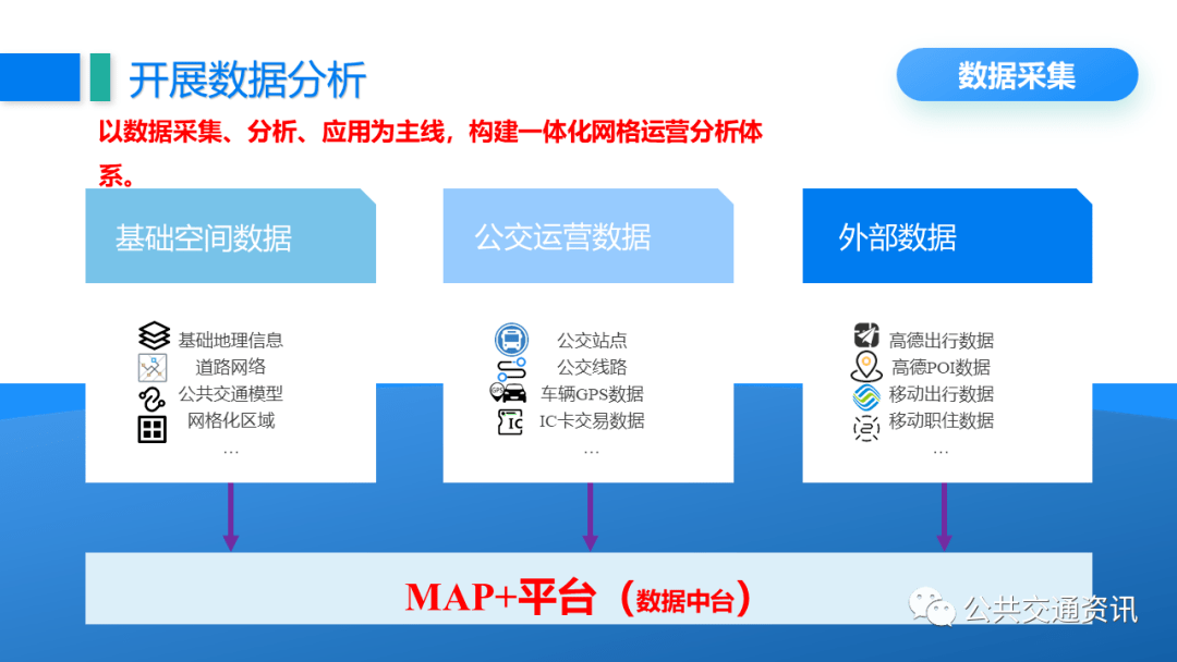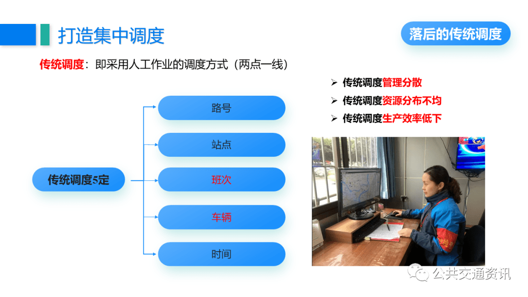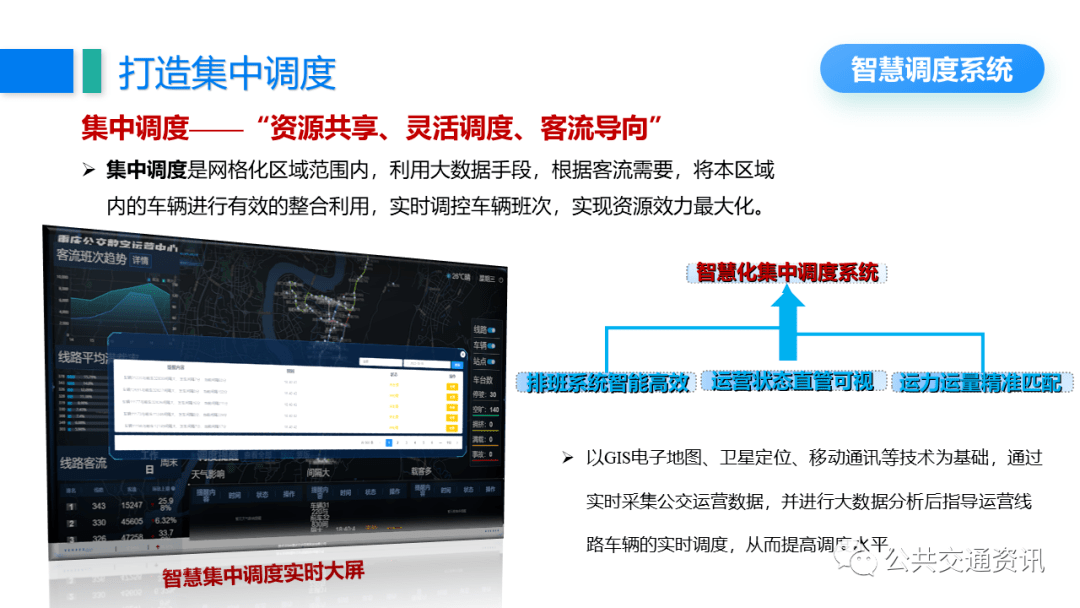 三是打造集中调度。集中调度——资源共享、灵活调度、客流导向。集中调度是网格化区域范围内,利用大数据手段,根据客流需要,将本区域内的车辆进行有效的整合利用,实时调控车辆班次,实现资源效力最大化。以GIS电子地图、卫星定位、移动通讯等技术为基础,通过实时采集公交运营数据,并进行大数据分析后指导运营线路车辆的实时调度,从而提高调度水平。