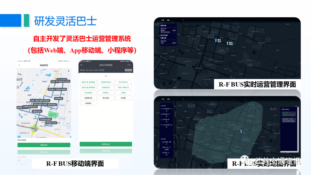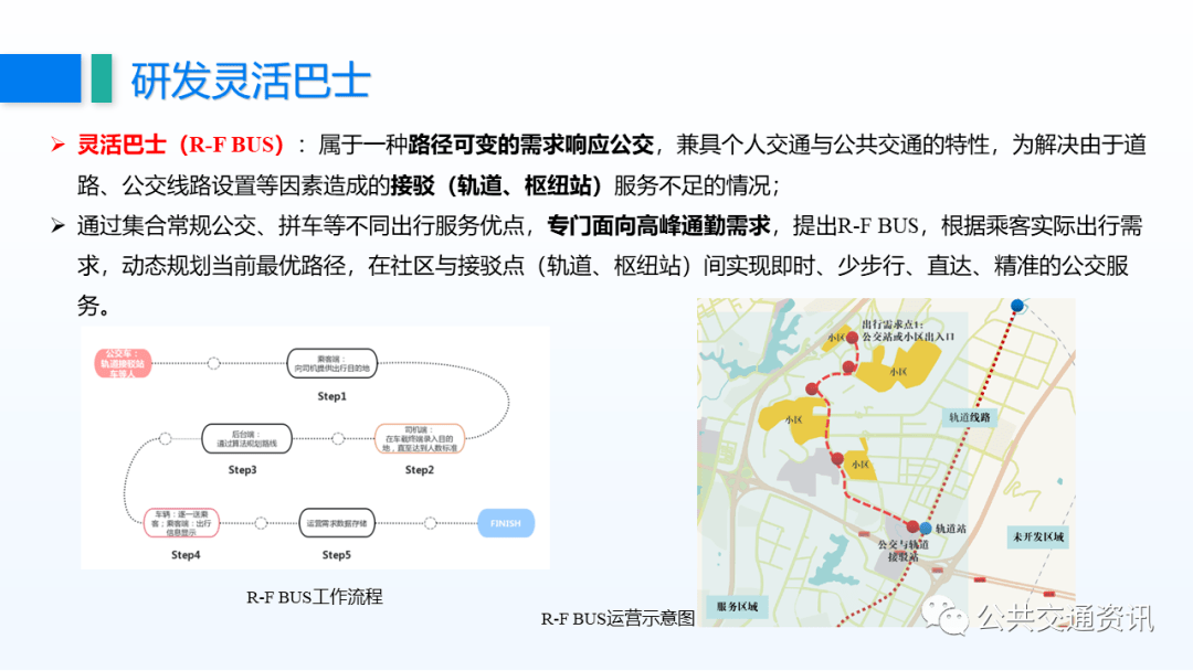 四是研发灵活巴士。灵活巴士(R-F BUS):属于一种路径可变的需求响应公交,兼具个人交通与公共交通的特性,为解决由于道路、公交线路设置等因素造成的接驳(轨道、枢纽站)服务不足的情况;通过集合常规公交、拼车等不同出行服务优点,专门面向高峰通勤需求,提出R-F BUS,根据乘客实际出行需求,动态规划当前最优路径,在社区与接驳点(轨道、枢纽站)间实现即时、少步行、直达、精准的公交服务。
