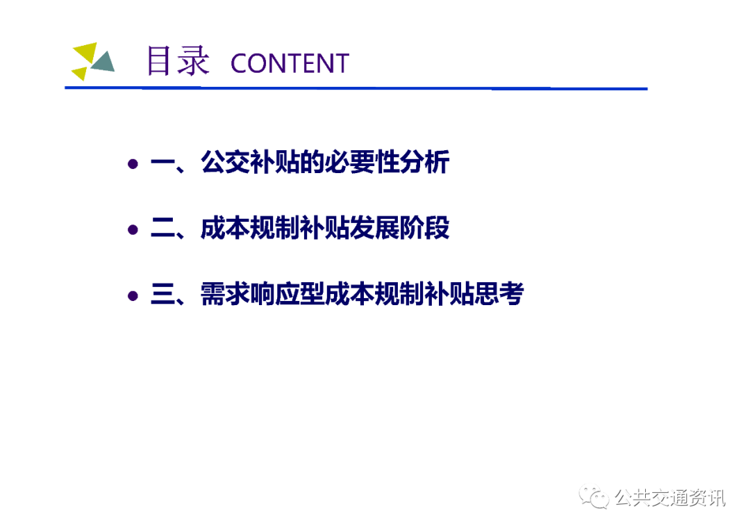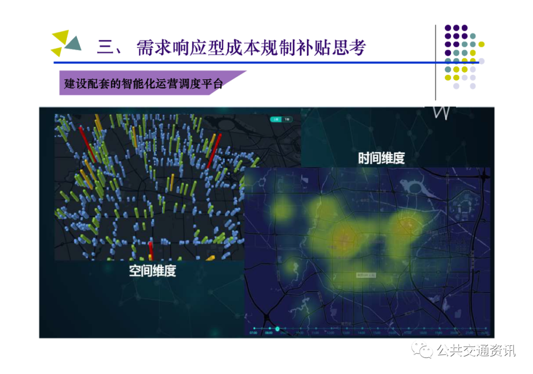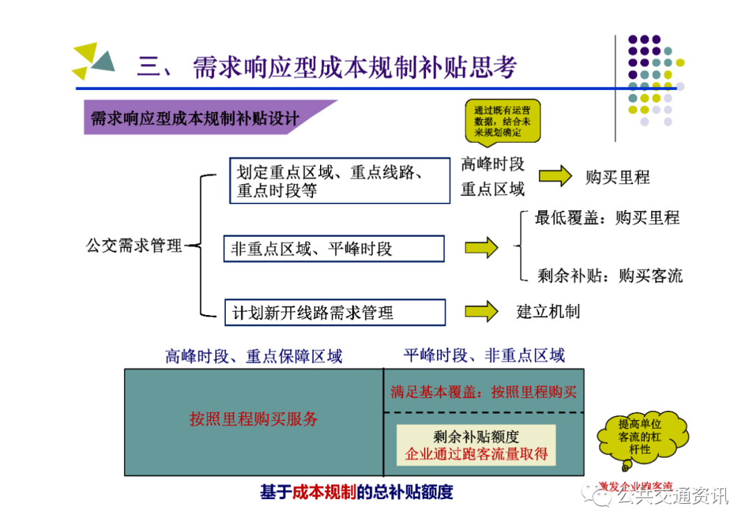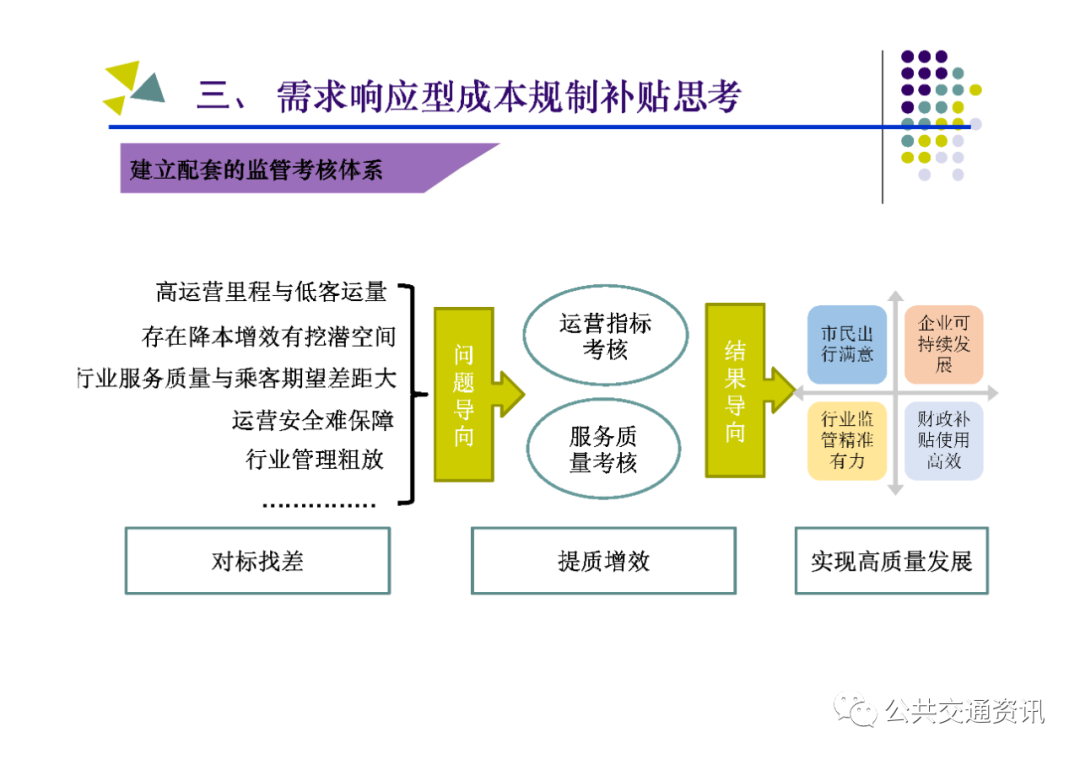 (二)需要把握的关键点:一是对公交需求进行科学管理,区分重点区域、重点线路、重点时段,结合实际制定差异化补贴策略;二是建立配套的监管考核体系,坚持问题导向,按照对标找差、体质增效、实现高质量发展的要求,深化运营指标和服务质量考核;三是建设配套的智能化运营调度平台,以信息化带动行业发展的规范化、标准化、科学化;四是多方合力推动行业高质量发展,财政、国资、交通运输、公安交警及公交运营企业各负其责、各尽其职,才能建设人民满意的公共交通。