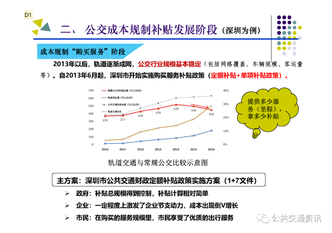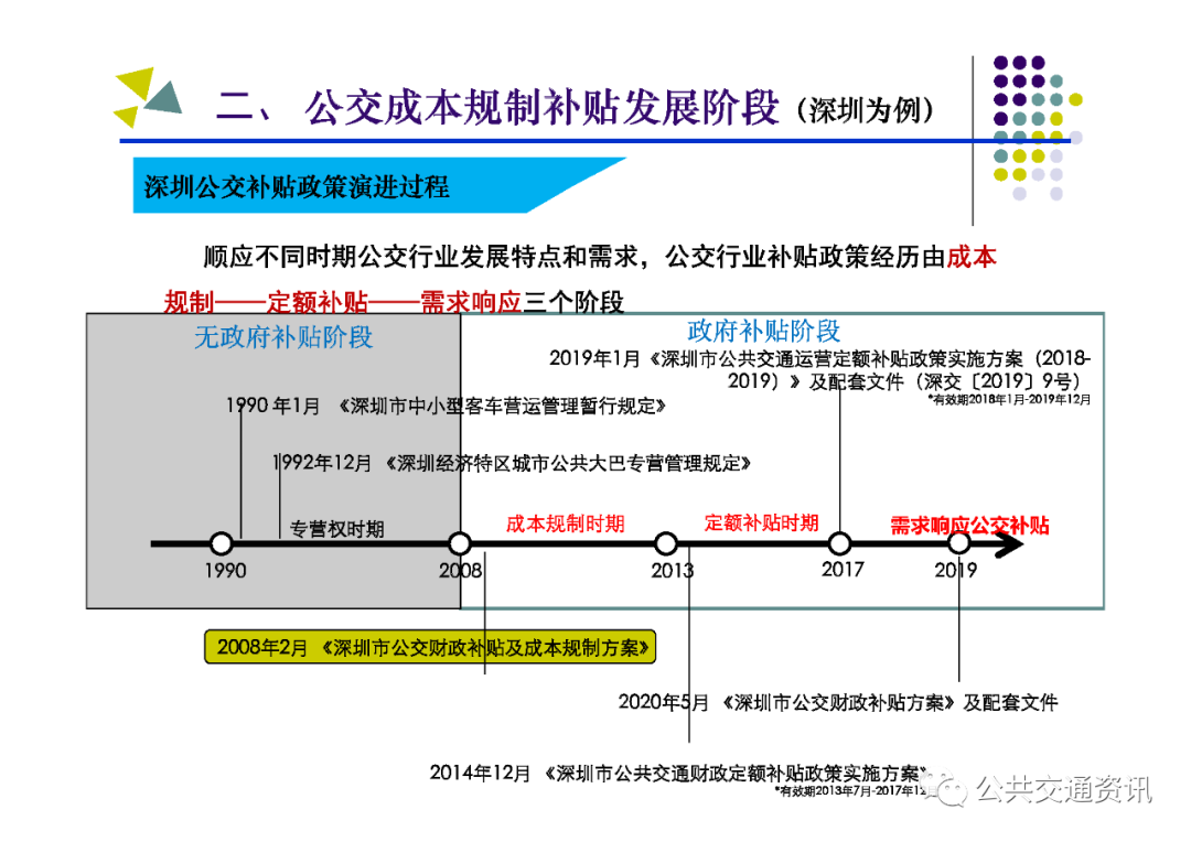 一是成本规制补贴阶段:2008年2月,深圳市为解决公交行业企业主体多、票价偏高、公交服务覆盖不足、城乡客运二元发展等问题,出台《深圳市公交财政补贴及成本规制方案》,建立了以成本规制财政补贴政策,公交企业有38家整合为3家,票价下降20%,车辆规模和线网覆盖率明显提高,冷僻线路陆续开设,公交服务保障能力迅速提升。
