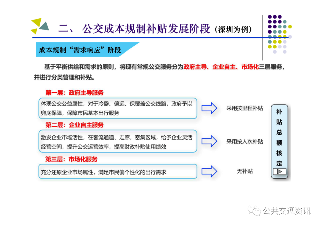 三是成本规制“需求响应”阶段:2020年,深圳市公交需求总量基本稳定,轨道交通与常规公交运营主体地位转换,加之新能源公交车推广应用及运营成本的变化,破解公交财政补贴资金持续上涨难题,特别是为打造国家公交都市全球标杆城市,进一步提升财政补贴效率,实现更高品质、更有效率的可持续发展,深圳市创新公交发展理念,出台全新的公交财政补贴方案及配套文件,基于平衡供给和需求的原则,将现有公交服务分为政府主导、企业自主、市场化三层服务,并进行分类管理和补贴,达到保基本民生、保重点区域、推动行业高质量发展的政策目标。