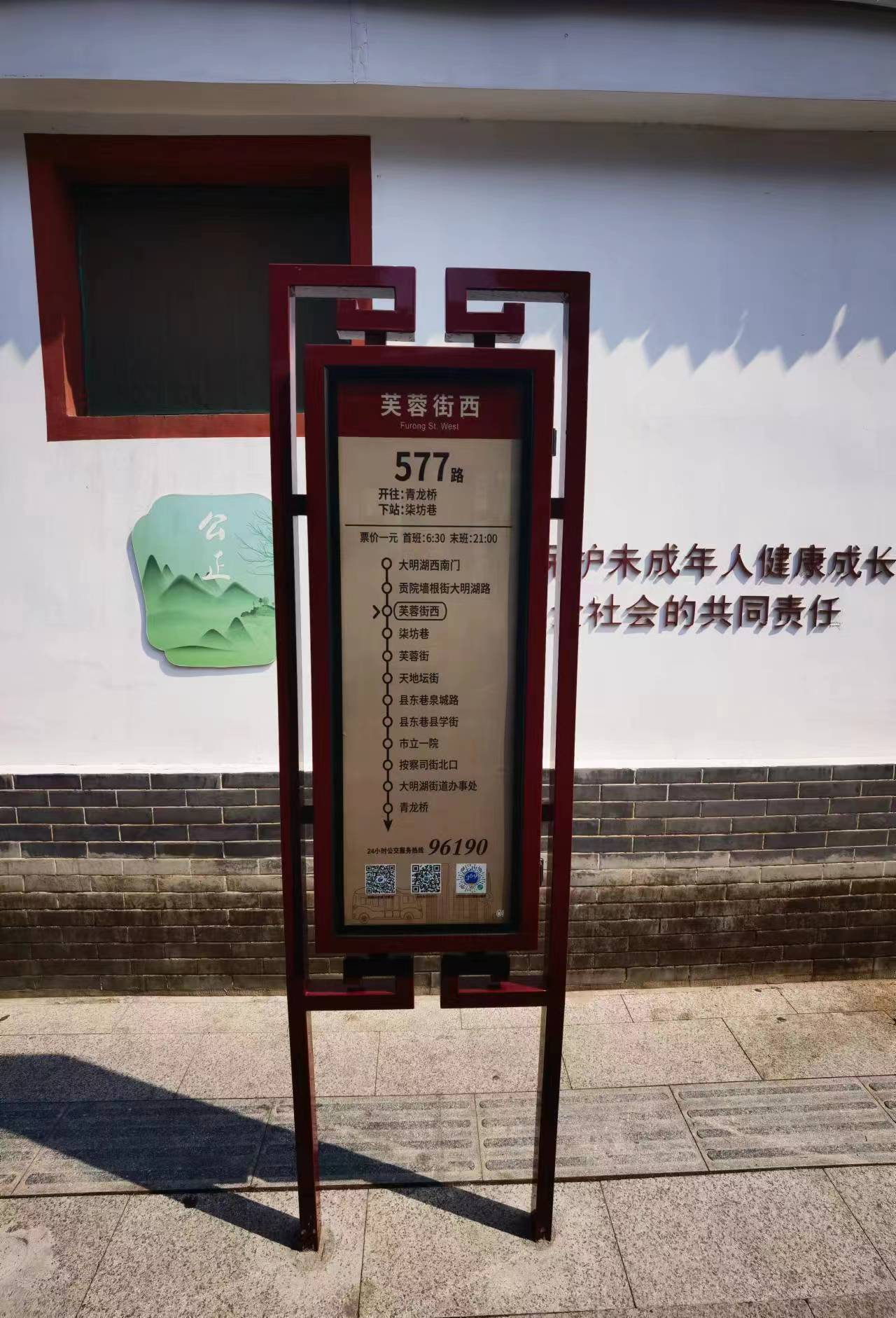 7月18日,公交司机王帆正驾驶577路“小巷公交”穿梭于小巷内。(邢婷/摄)“拉着这些乘客,就像拉着家人一样亲切。”33岁的王帆笑容甜美,她坦言,工作的每一天都有“满满的幸福感”。在山东省济南市,和577路一样的“小巷公交”已有50辆,服务于专为社区居民设计的8条线路。它们体型小巧,颜色鲜亮,是孩子眼中的“宝宝巴士”、年轻人眼中的“红墩墩”、老年人眼中的“代步专车”;更重要的是,它们打通了小街巷居民出行的“最后一公里”。577路站牌别致醒目,3.6公里路程,途经大明湖、芙蓉街等多个景点,以及3个大型老旧小区。(邢婷/摄)主题教育开展以来,济南公交集团念好“实”字诀,在深入调研基础上全力打造“小巷公交”民生品牌,以此检验学习程度、发现改进之处、彰显民生情怀,推动主题教育取得扎实成效