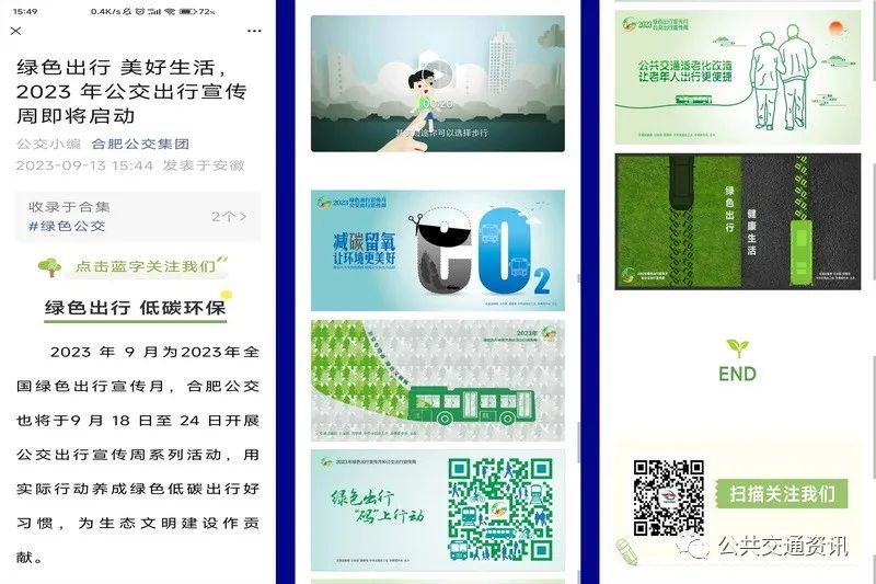 合肥公交集团充分利用宣传载体,密集宣传2023年绿色出行宣传月和公交出行宣传周活动主题“绿色出行 美好生活”。合肥公交集团智慧指挥中心LED屏播放2023年绿色出行宣传月及公交出行宣传周公益海报。 合肥公交集团110个站点调度屏播放2023年绿色出行宣传月和公交出行宣传周海报,激励公交驾驶员安全文明行车,提供优质服务。合肥市580余座公交电子站牌连续播放2023年绿色出行宣传月及公交出行宣传周公益广告。合肥公交集团微信公众号发布2023年绿色出行宣传月及公交出行宣传周公益广告。绿色城市需要绿色交通,健康出行呼唤公交优先。连日来,合肥公交集团紧密围绕“绿色出行 美好生活”活动主题,周密谋划,精心组织,积极谋划开展多项主题活动,宣传优先发展城市公交重大意义,推进公交优先和绿色出行、提升公交服务水平等方面取得的成绩,进一步促进公众提高绿色出行意识,养成绿色低碳出行习惯,着力提升生态文明建设成果。积极营造宣传氛围。充分利用合肥公交集团官网、“合肥公交集团”微信公众号、公交集团LED屏、电子调度屏、全市580余个公交LCD电子站牌等渠道,发布绿色出行宣传标语、宣传海报、公益视频,提升活动的影响力与覆盖面,大力倡导市民外出优选公共交通,积极主动参与绿色低碳出行,为生态文明建设作贡献。优化调整公交线路。拟新开一条旅游公交线路,已有的20条旅游公交线路继续开放预订。根据公交线网发展规划、道路建设、公交首末站建设情况,对有关公交线路实施延时服务、增加运力和路牌计划,保持高频次发车。做好与轨道交通线路接驳,进一步改善公共交通出行环境,方便市民乘车出行。做好园博会服务保障。第十四届中国(合肥)国际园林博览会即将在我市举行。公交集团将计划开通园博会专线、园博会轨道接驳线和应急停车场接驳线,做好密集客流的疏导,并优化周边公交线网,全力保障合肥市民赴园博园游览观光出行。开展进高校宣传活动。组织省市级“青年文明号”“青年安全生产示范岗”等志愿者走进高校校园,开展“绿色出行美好生活”宣传推广体验活动,指导大学新生下载、安装、使用“合肥智慧公交”APP;介绍扫码乘坐公交车方法,丰富大学新生群体乘车体验,进一步增强公交出行方式对大学生群体的吸引力。发布《社会责任报告》。报道合肥公交集团发布2022年度《社会责任报告》。全面回顾2022年度合肥公交集团生产经营活动和社会实践,充分展示合肥公交集团坚持公益性定位,在服务市民出行、促进城市发展、履行社会责任等方面的亮点工作。关爱老年群体出行。扎实推进公交适老化服务。报道合肥公交集团多年来服务老年群体乘车出行推出的爱心举措,提高老年乘客的安全文明出行意识。宣传“全国敬老文明号”合肥公交109路和2路、7路公交打造适老线路新进展。宣传公交先进人物。报道公交先进典型事迹,举办新学期安全乘坐公交车为主题的宣讲活动,在学生群体中宣传绿色出行理念,积极倡导、大力培育优先选择公共交通、绿色低碳出行方式。开展志愿服务活动。公交出行宣传周及园博会期间,组织公交集团“风景线”志愿服务队、“高星之家”“力哥”志愿服务队到客流密集的公交枢纽站、首末站开展志愿服务活动,宣传“礼让斑马线、守法文明行”,引导乘客排队乘车,劝阻和制止不遵守交通信号的行为,清理公交站台上乱停乱放的共享单车,杜绝乘客携带危险品乘车,为市民指路答疑。走访调研部门联动。绿色出行宣传月期间,公交集团领导及营运管理部等部门负责人将赴有关县区、开发区,与政府部门及相关交通运输单位联系对接,征求对公交线路布设、线网优化、站点设置、服务时间等意见建议。不忘初心,牢记使命。交通强国,公交先行。合肥公交集团将以开展绿色出行宣传月和公交出行宣传周活动为契机,加强组织领导,强化舆论宣传,狠抓内部管理,做好运营保障,积极实施服务供给创新,激发公交职工的积极性、主动性、创造性,提高服务水平,加强品牌建设,提升行业形象,创建文明和谐、绿色低碳的交通出行环境,推动绿色公交、平安公交、智慧公交、幸福公交建设,书写新时代合肥公交发展新篇章。(李克武)