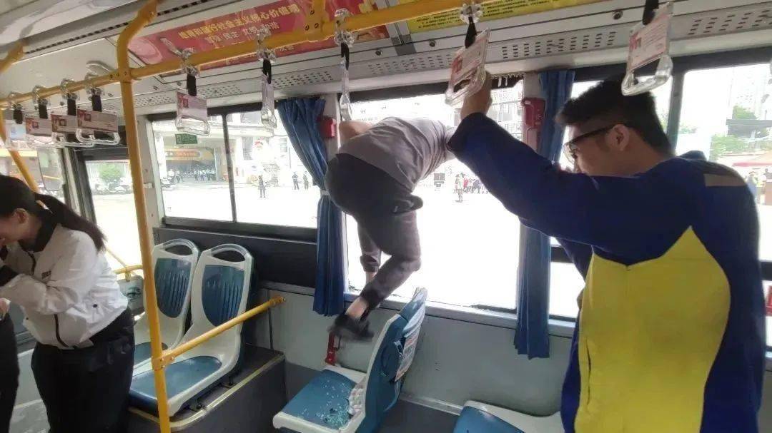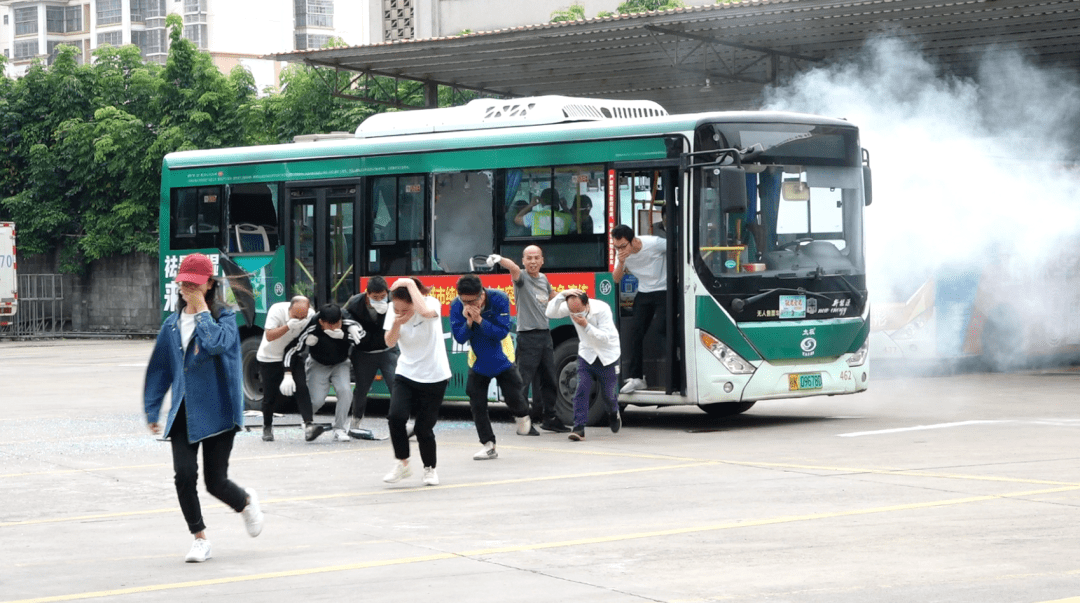 情景模拟:一辆载有20人的新能源纯电公交车在营运途中,车厢内后门处突然冒烟起火,由于车辆线路部分烧坏,车辆前后门均无法打开,情况十分危急。