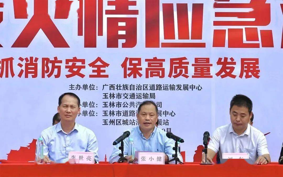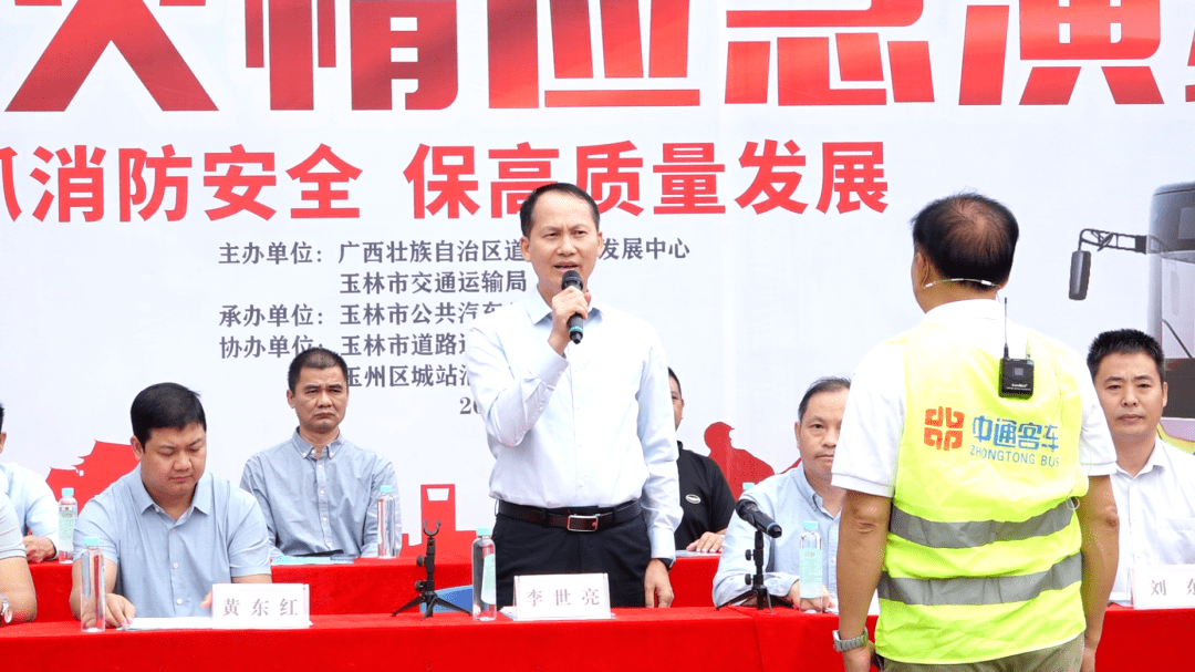 为检验和提升城市公共汽电车应对火灾事故应急处置能力,增强应急预案的操作性和实效性,进一步提高公交企业应对突发事件的能力和水平。为全面检验和提高玉林市城市公交客运企业安全生产应急救援体系的反应能力、救援能力以及协同能力,确保在生产安全事故突发时,能最大限度减少事故危害,保障司乘人员和财产安全,进一步加强我市城市公交客运企业突发事件应急处置能力,2023 年 10 月 13 日,由广西壮族自治区道路运输发展中心和玉林市交通运输局主办,玉林市公共汽车公司承办的2023年玉林市城市纯电动公交车突发火情应急演练活动在玉林市公共汽车公司停车场举行。广西壮族自治区道路运输发展中心主任张小健、玉林市交通运输局局长李世亮、玉林市道路运输发展中心主任阙敏、玉林交通旅游投资集团有限公司副总经理黄东红参加了此次安全应急演练。