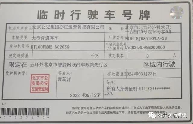 历时一年多的艰辛努力,经过感知系统标定、线控适配、控制调优、封闭场地考试、可靠性测试、申请进入北京市高级别自动驾驶示范区、专家评审、应急演练等一系列工作,2023年9月,北京公交集团作为牵头单位,亦庄运营公司、福田欧辉公司、轻舟智航公司作为联合体,取得北京市高级别自动驾驶工作办公室印发的《智能网联汽车道路测试通知书》,并获得北京市公安局公安交通管理局颁发的路测牌照。这是北京公交取得的第一张大型普通客车自动驾驶路测牌照,意味着北京公交高级别自动驾驶车辆正式跨过封闭场地测试阶段、进入地面公共交通实际运营场景的开放道路测试阶段,将在北京市智能网联汽车政策先行区内开展上路测试。