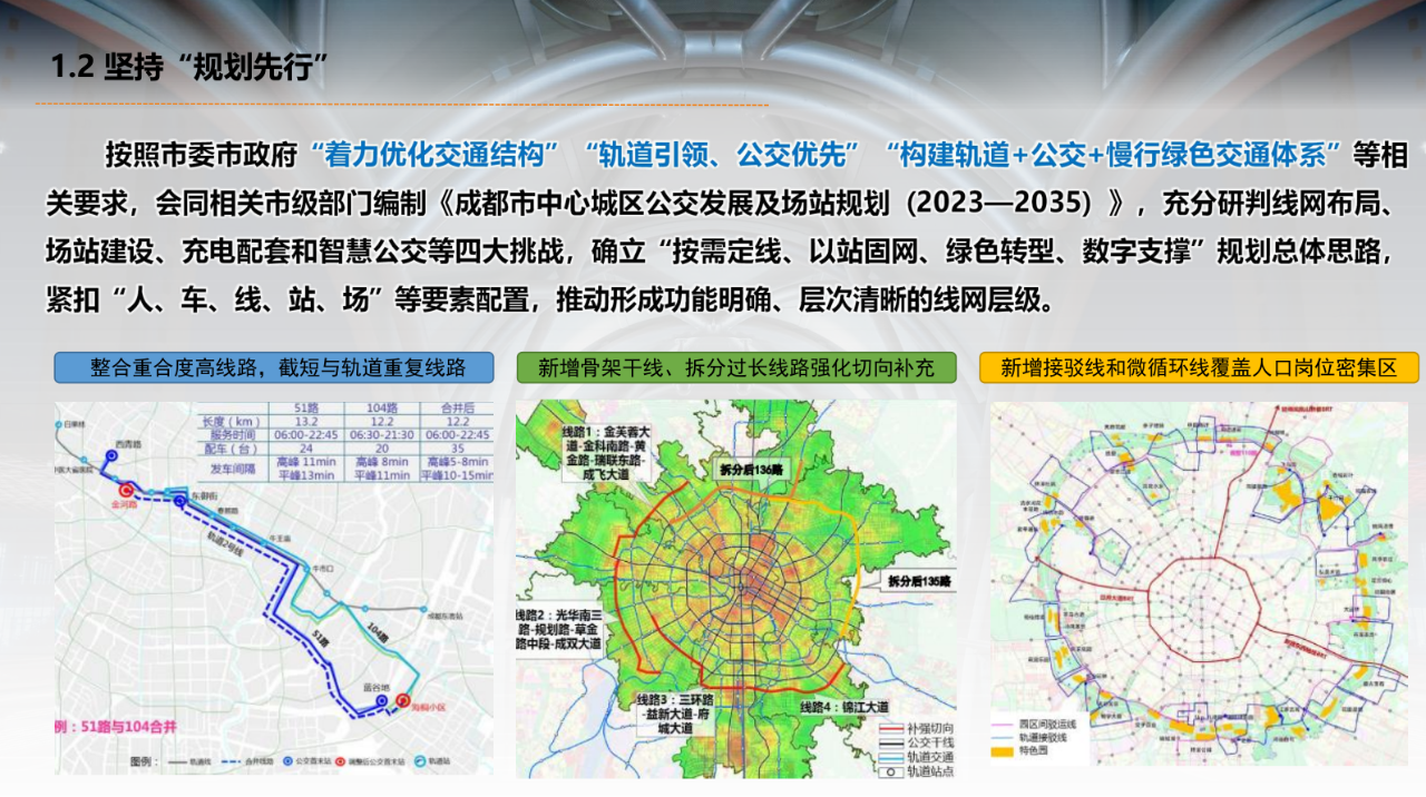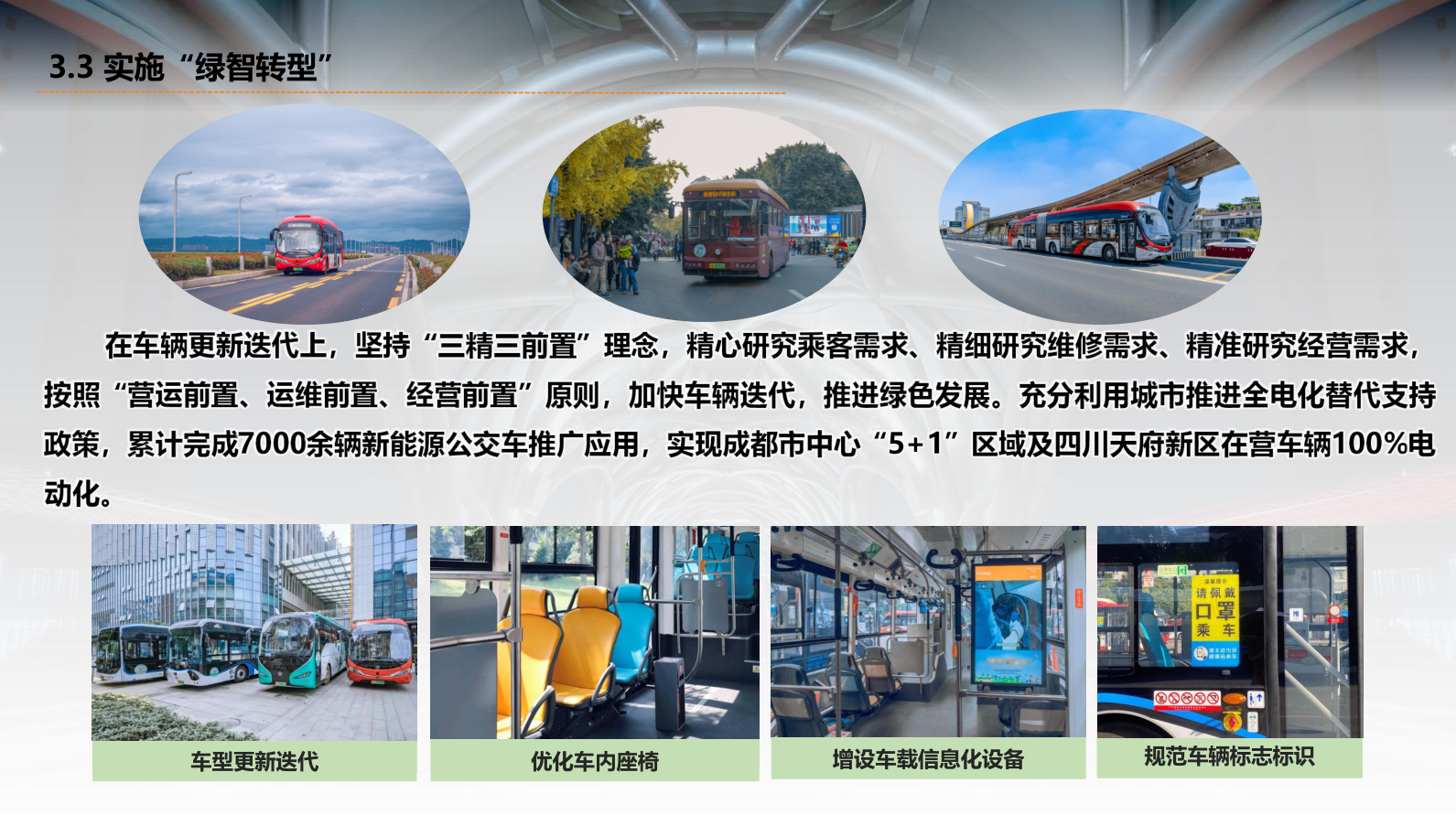 习近平总书记指出,发展公共交通是现代城市发展的方向,党的二十大吹响了奋进新征程的时代号角,高质量发展成为全面建设社会主义现代化国家的首要任务。随着科技的快速发展,城市经济地理、市民的出行需求、交通运输方式等方面都发生了深刻变化。加快公交改革与创新,走高质量发展之路,成为行业主管部门、公交同行的广泛共识和重要行动。近年来,成都公交集团始终坚持以人民为中心的发展思想,紧紧围绕成都市委市政府关于中心城区、郊区新城、产业新区三个”做优做强“和城市、产业、交通、能源四大结构优化调整等决策部署,聚焦主责主业,强化谋划部署,从四个创新方面来推动改革发展的转型。在全面服务城市战略、助推经济社会发展、保障市民出行需求等方面积极探索,并取得了初步成效。一是突出战略引领,“十四五”期间,围绕成都市国际门户枢纽城市、国家中心城市和世界文化名城的城市发展定位,抢抓交通强国建设、”双循环“等战略激励,确立了”建设一流的公交出行综合服务商,打造一流的公交产业集团“的企业发展战略目标,明确智慧交通、绿色共享、全面友好、幸福出行、人民至上、平安护航等核心理念,着力实现两网融合、绿智转型、多元发展三大战略转变,科学完善的战略规划引领成都公交高质量发展跑出”加速度“。二是坚持规划先行,构建“轨道+公交+慢行”绿色交通体系的相关要求。会同相关市级部门,编制了《成都市中心城区公交发展及场站规划(2023-2035)》,确立了”按需定线、以站布网、绿色转型、数据支撑“总体思路,推动形成功能明确、层次清晰的线网层级,加快构建两站两场的场站体系。计划优化线路550余条,布局各类场站560余处,有力支撑成都公交成为”公园城市绿色出行的强支撑,交通结构低碳转型的动力源“。