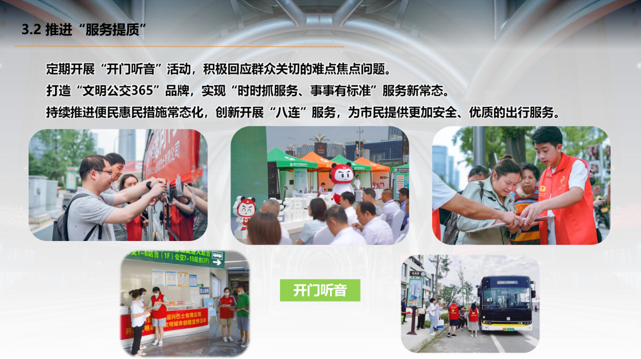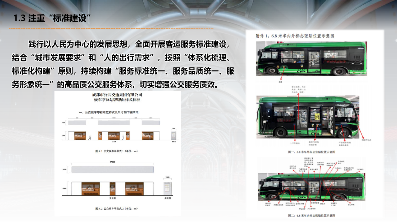 三是注重标准建设,全面开展客运服务标准建设,结合城市发展的要求和人的出行需求,按照”体系化梳理、标准化构建“的原则,凝炼了《公交客运服务标准》、《公交线网优化及运营生产实施标准》、《成都公交集团VI基础系统使用规范》等服务系统106项,持续构建”服务标准统一、服务品质统一、服务形象统一“的高品质公交服务体系,切实增强公交服务质效。