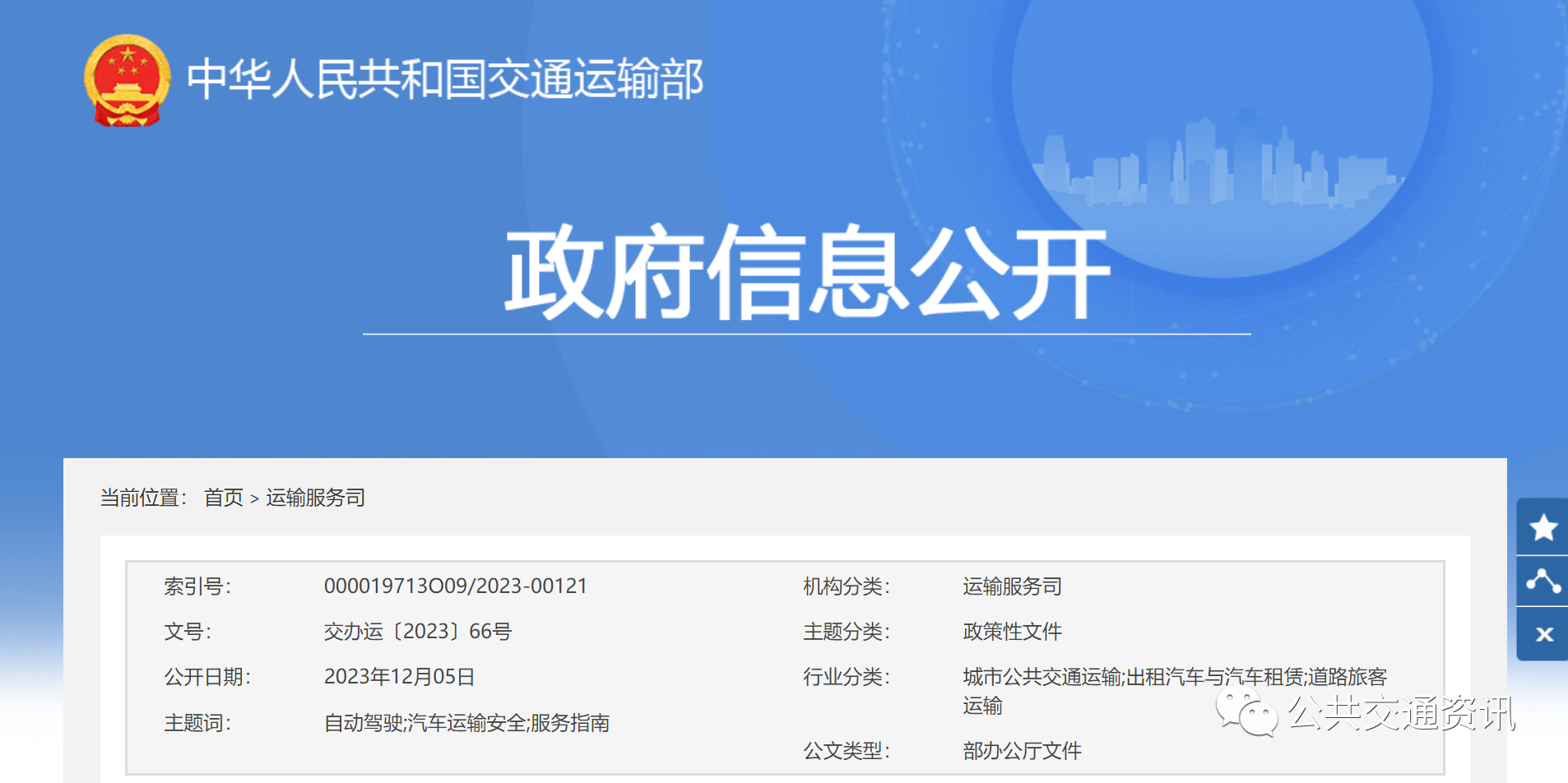 为引导自动驾驶技术发展,规范自动驾驶汽车在运输服务领域应用,依据《中华人民共和国安全生产法》《中华人民共和国道路交通安全法》《中华人民共和国道路运输条例》等法律法规,以及道路运输、城市客运管理有关规定,我部组织编制了《自动驾驶汽车运输安全服务指南(试行)》,现印发给你们,请结合实际认真贯彻落实。