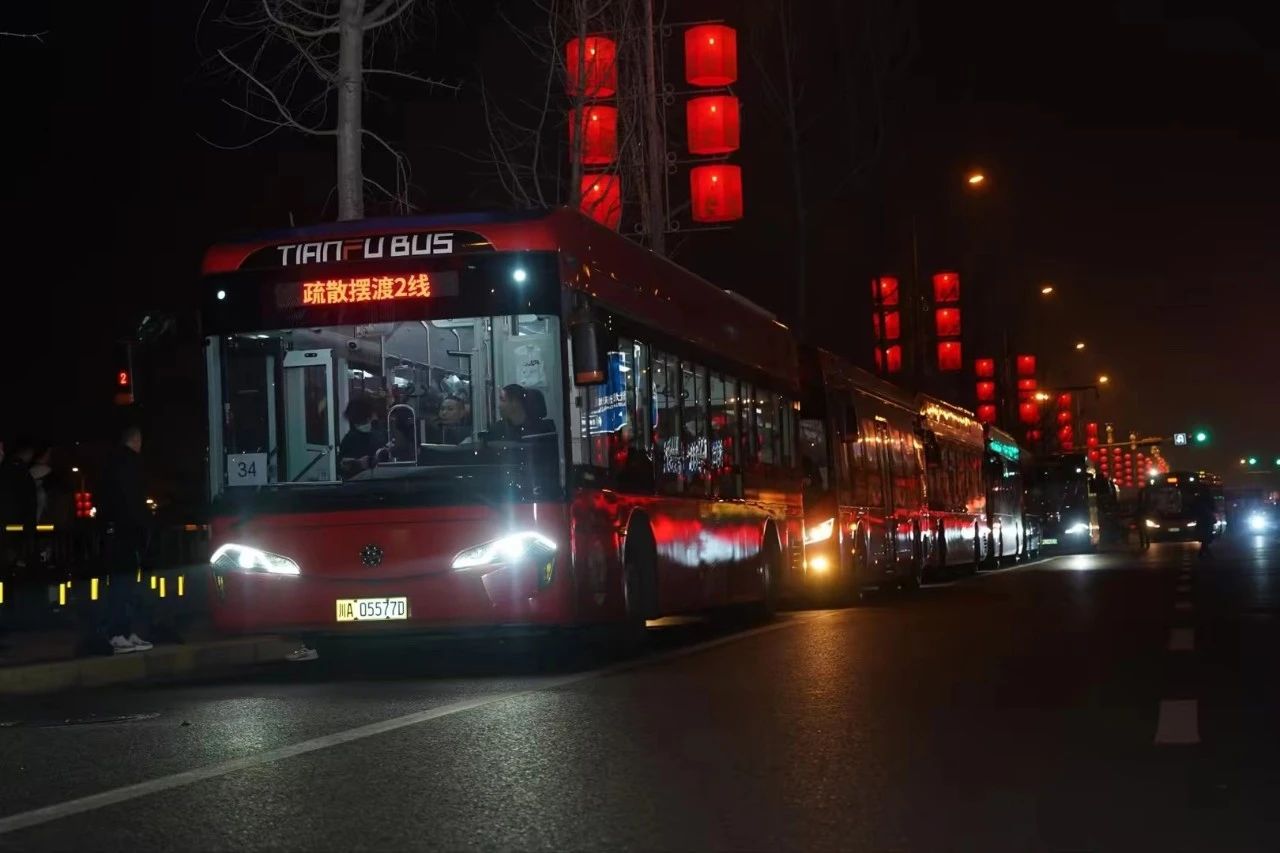 除夕当日,成都公交“天府之檐”活动保障专班工作组,增加T1、T7、T100等5条常规公交线路活动时段运力投放,缩短发车间隔至10分钟/班;开行环主会场、大悦城-兴隆湖2条接驳线路,运送近4000人次。