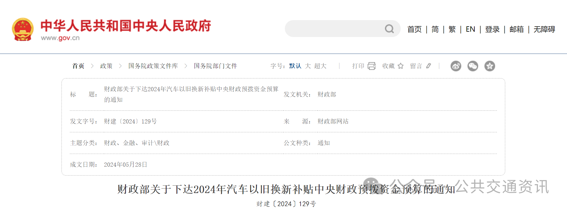 财政部关于下达2024年汽车以旧换新补贴中央财政预拨资金预算的通知