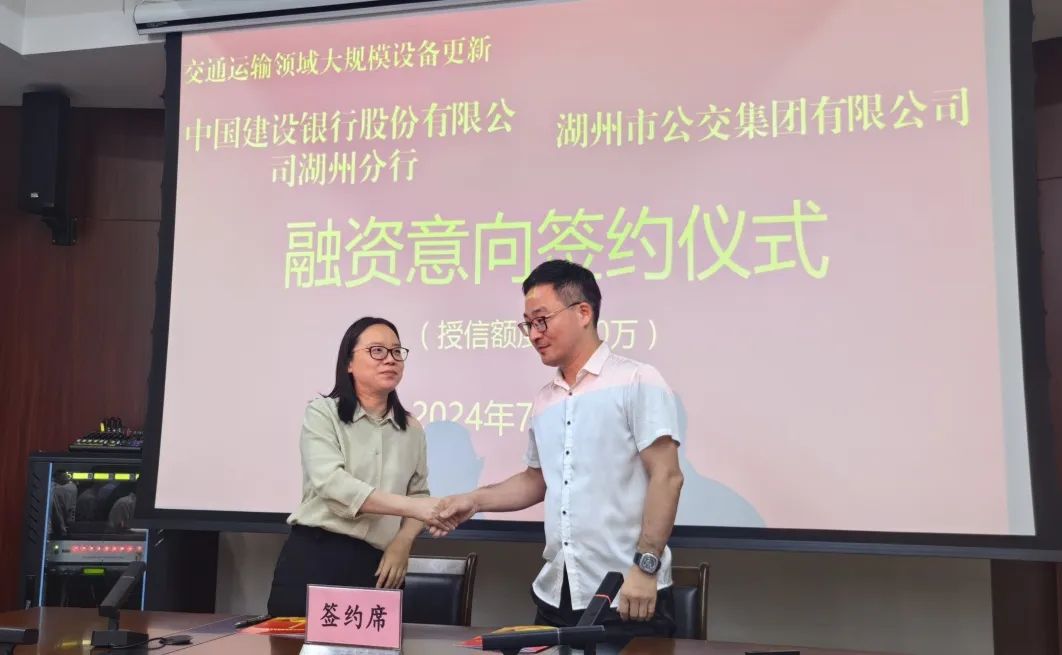 为推动大规模设备更新和消费品以旧换新,持续助力城市公交绿色发展,近日,湖州交通集团所属湖州公交与中国建设银行股份有限公司湖州分行签署融资意向协议,首期授信额达 1000 万,有效改善了湖州公交运营的资金压力,为企业长期稳健发展筑牢了坚实基础。