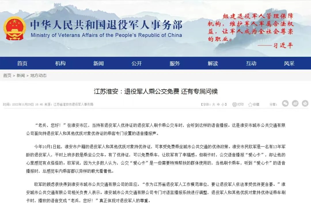淮安市城市公共交通有限公司(简称“淮安公交”)现有员工2010余人,其中退役军人263人,随军家属4人。近年来,淮安公交坚持以习近平新时代中国特色社会主义思想为引领,以“让退役军人成为全社会尊重的人,让军人成为全社会尊崇的职业”目标为遵循,以提高退役军人归属感、荣誉感、幸福感为追求,精心打造“幸福老兵”退役军人工作品牌,先后荣获“全国文明单位”“全国工人先锋号”“江苏省退役军人工作模范单位”“江苏省优秀‘戎耀之家’”等122项国家、省、市级殊荣。
