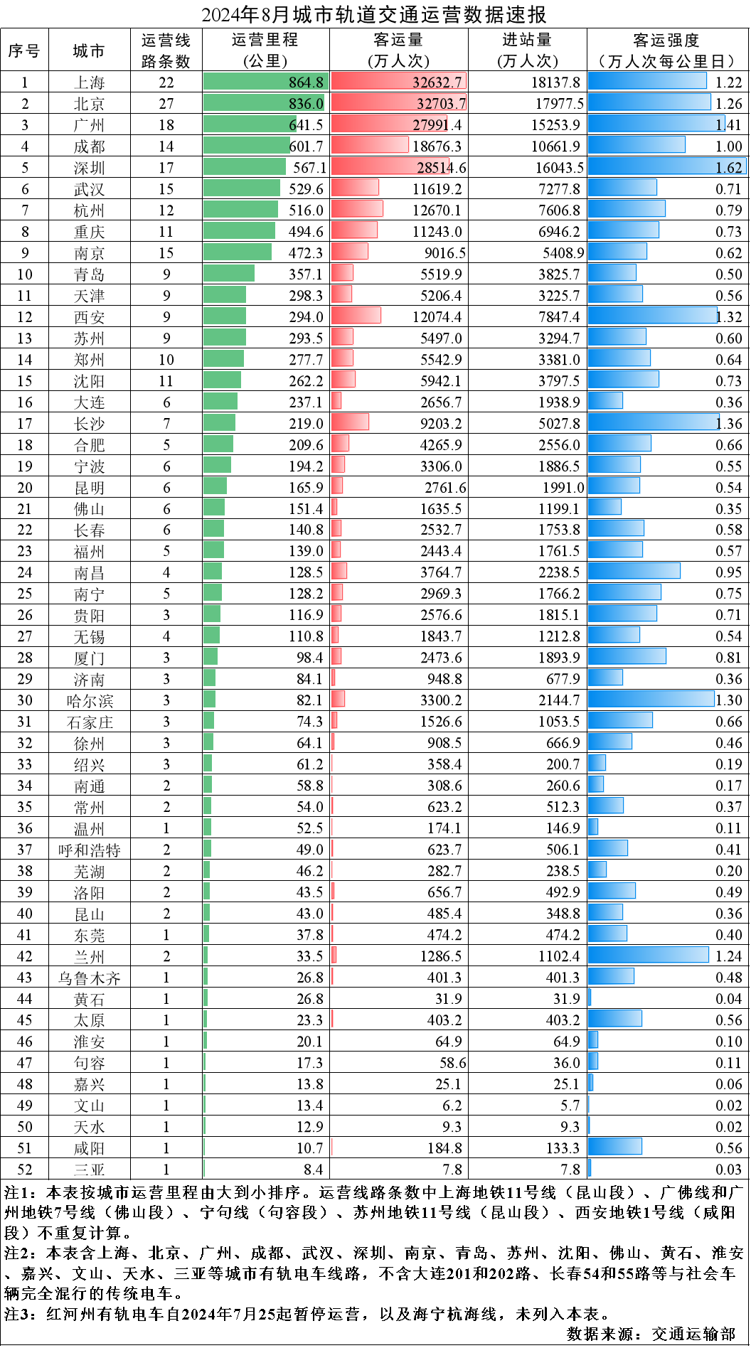 其中,地铁、轻轨、市域快速轨道等大运量线路共271条,运营里程9666.1公里,完成客运量27.6亿人次,进站量16.4亿人次;单轨、磁浮等中运量线路共7条,运营里程202.5公里,完成客运量3402万人次,进站量2447万人次;有轨电车、自动导向轨道等低运量线路共33条,运营里程494.9公里,完成客运量1077万人次,进站量1021万人次。