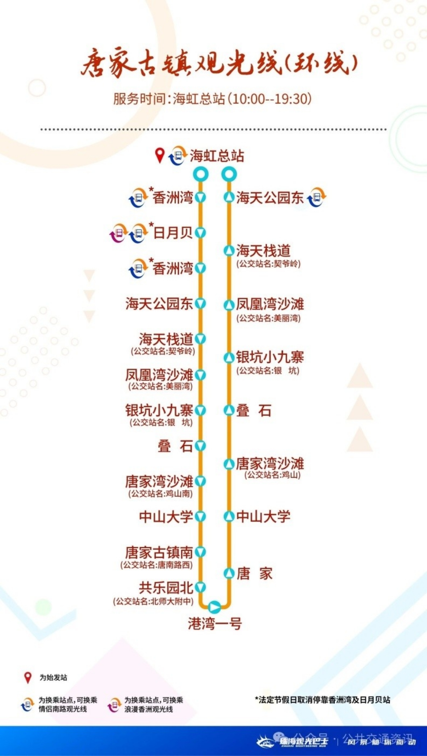 新开行的唐家古镇观光线以环线形式运营,全程30公里,单程运行约60分钟,服务时间为10:00-19:30,每30分钟一班,全天发车20班次。唐家古镇观光线以情侣路“黄金海岸线”为轴心,向北延伸至唐家古镇,向南衔接香洲老城,线路串联日月贝、珠海博物馆、海天驿站、小九寨、唐家湾沙滩、中山大学、唐家古镇等30公里黄金动线。这条全新线路以“历史人文+近海休闲”为特色,,推动珠海滨海旅游从“自然观光”向“多元体验”跨越,加速构建“一核两翼”全域文旅新版图。