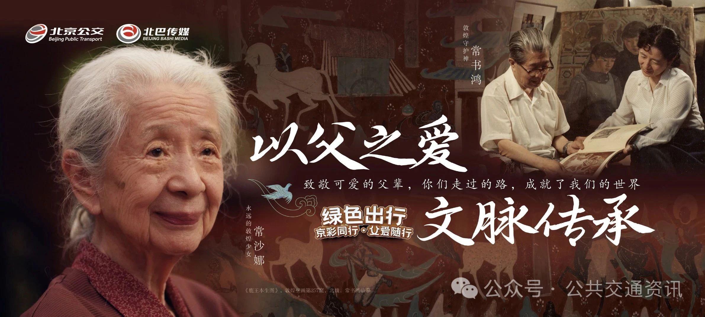 大漠千年,风沙吹不散的,是一位父亲的执念;时光九十余载,画笔勾不尽的,是一位女儿的记忆。“敦煌守护神”常书鸿的女儿常沙娜,工艺美术家、艺术教育家。她的一生,如同一幅徐徐展开的敦煌壁画,而画轴的起点,是父亲的背影。在父亲节,我们回到敦煌,回到那片生长爱的风沙中——常沙娜娓娓叙述着古城千年文化与“绿色出行”理念的碰撞。她深情回顾父亲守护敦煌的毕生奉献,以父之爱,文脉相承。在海报画面中,其父亲临摹的《鹿王本生图》元素蕴含着古人智慧,即“护一命如护万物,行一程如敬自然。”这与我们提倡的“绿色出行、低碳出行”理念不谋而合,传递着尊重生命的权利、为人类谋福祉的深层含义。95岁高龄的常沙娜先生凝望着主题车身画面,深情介绍道“洞窟里的壁画,多美呀,那里头可是古人出行的纪录片!这辆披着‘敦煌色’的公交车,载着的,是一个活着的、呼吸着的、属于未来的莫高窟梦想。这感觉,多像致敬古画里那些奔向美好地方、不断努力前行的人们!”让千年文化遗产焕发出光照当下的时代新意,让传统文化与现代环保理念深度共鸣。