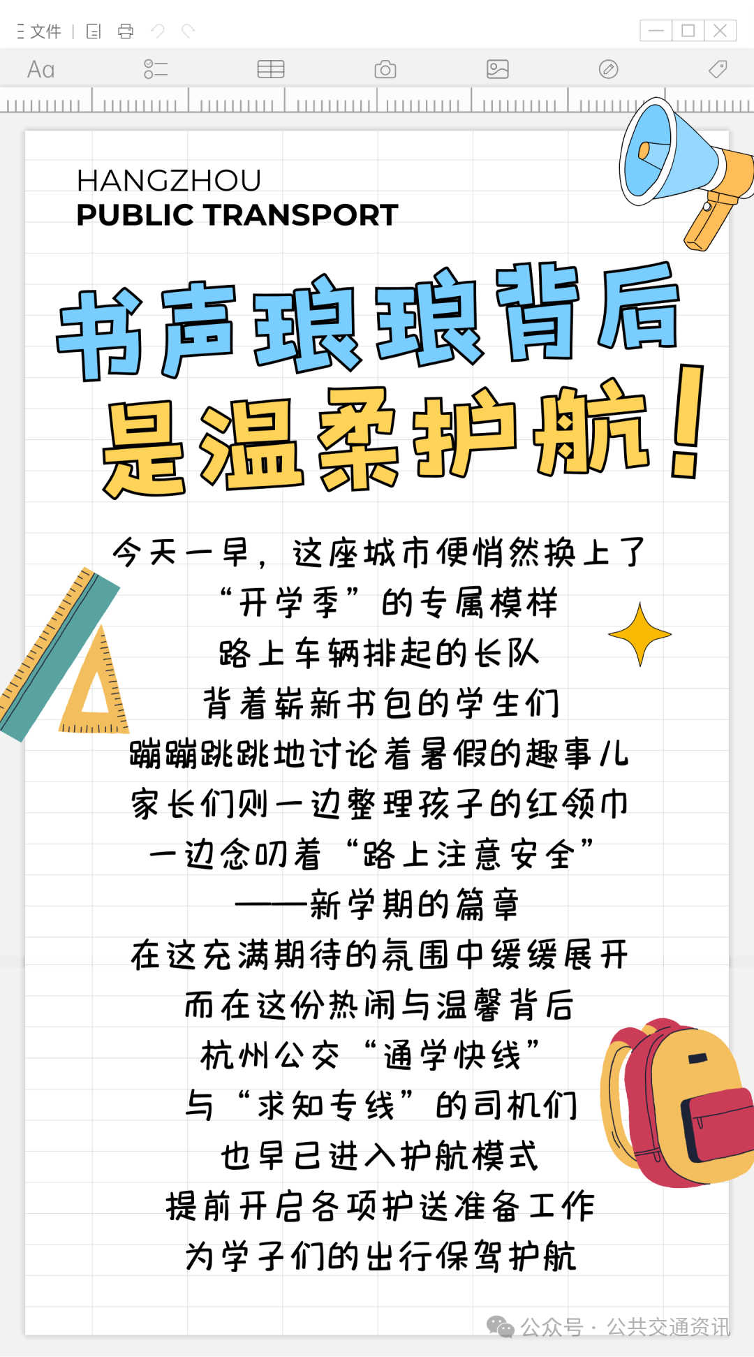 为进一步提升公共交通服务水平,切实解决学生出行难题,杭州公交通过公交小灵通进社区收集到的市民的意见建议,再到现场踏勘后研究决定,自9月1日起,开通试运营杭海路小学临时接驳线。此条线路的开通为三卫路沿线天铂府、时光里等小区的学生,提供更加便捷、高效的出行选择。